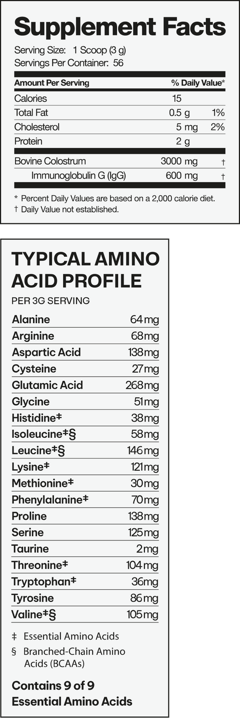 Colostrum helps reinforce and repair the gut lining with antibodies (IgG, IgA) to strengthen immunity, growth factors to support repair and recovery, and prebiotics to nourish a balanced microbiome. Together, these compounds work to seal gaps, block invaders, and fortify your body's natural defenses — helping you feel stronger, healthier, and more resilient every day.